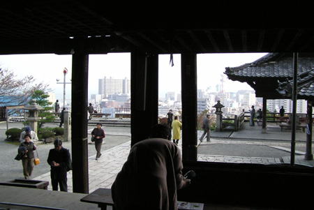 観音堂からは大津の街並と琵琶湖が望め、 街を見守るという温かみを感じる素朴なお堂である。 『三井寺 除夜の鐘 受付』の立札があり、お一人様二千円と書かれている。