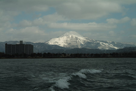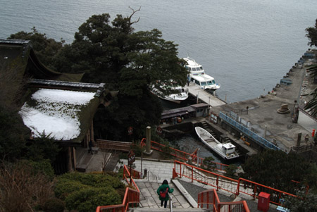 長浜の街ごしに伊吹山がくっきりと見える。伊吹さんは東と西から見るのとでは山容をまったく変える。岐阜で生まれ育った私は、東にあたる岐阜から見る伊吹山がやはり好きだ。 30分ほどで竹生島に着いた。遊覧船から10人余りの客が下り、案内にしたがって石段へ。