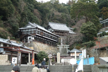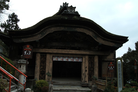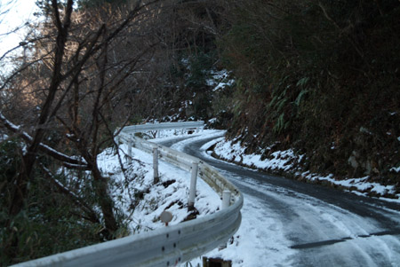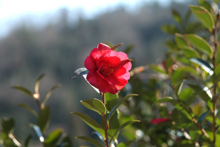 長命寺から車で30分程の32番札所に向かうが、氷結のため山麓の駐車場でストップ、ここからは歩いて山頂の本堂へ。途中、山茶花を撮っていると、下山されてきたご夫婦が、『すべるから気をつけて』と声をかけて下さった。奥様が道ですべって頭をうたれたとのこと。 なるほど、上にゆくと雪が凍ってすべりやすくなっていた。
