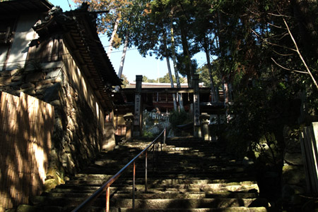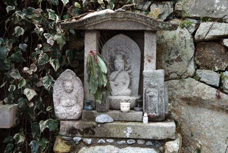 石段を登り始めると左手に昔より多くの巡礼を見守った石仏があり、さらに上に登りつめると弁財天のお堂と三十番札所の納経所があった。 が、肝心の観音堂が見当たらないので尋ね、左に石段を船着場の方に下りて行くとお堂らしき建物が見えた。