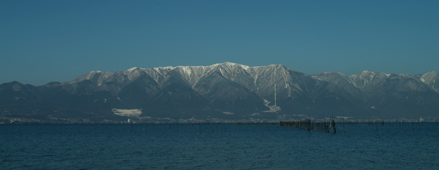 29日朝、琵琶湖大橋のたもとのホテルから近江八幡の湖畔にある三十一番札所に向かう。 途中、対岸の比叡山がくっきりと美しく撮影。くいのように見えるのは琵琶湖に独特のエリと呼ばれる定置網漁法の仕掛け。