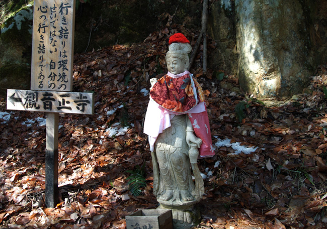 参道を歩いていくと素敵な観音様に出会った。車だと目にも留まらなかったであろう。 写真のような立て札も多く、他には『人は有るものを粗末にし、無いものを欲しがる』、『積善の家には余慶あり』といったものが、反省もあり心に残っている。