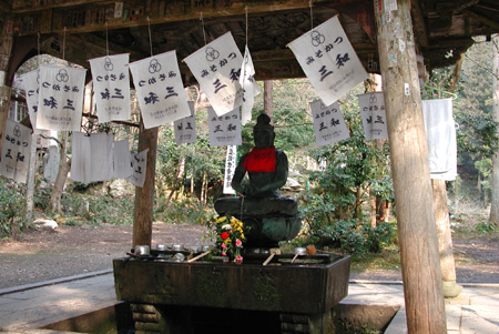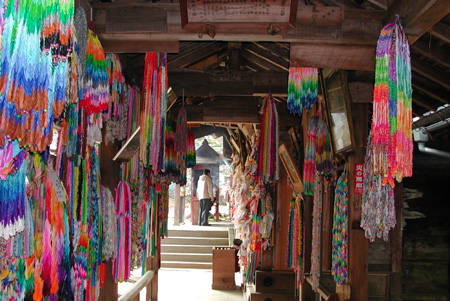 本堂を縁に沿って巡ると、左手においずる堂がある。千羽鶴に彩られた渡り廊下を渡ると、巡礼の間にまとった白いおいずるや菅笠や納経帳が奉納され、うず高く積まれてある。 本堂裏手に進むと身代わり地蔵さんが座しておられる。自分の体にわるいところがあれば、1枚10円のお札を地蔵さんのその部位に水に濡らして貼り、お祈りをする。私は三枚、家内は五枚を貼った。