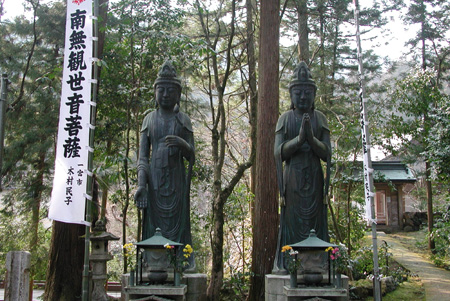 駐車場から山門まで300mほど続く参道の両側にはみやげ物や飲食の店が並ぶ。 近頃、目を引くのは仏画・仏像・仏具などの店で、中国製の商品が多いようだ。比較的安く、白木の観音像を物色するが気に入ったものがなかった。 山門の仁王像は運慶作と伝えられる。