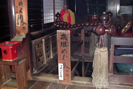 ご本尊は十一面観音菩薩で秘仏である。 お勧めは、意外と知られていない戒壇めぐり。冷気漂う真っ暗な闇を足もとおぼつかなく進むと、光明がさす。信濃の善光寺の戒壇めぐりが有名だが、私はここの戒壇めぐりが好きだ。でも今回は岐礼の観音堂にも立ち寄ろうと、時間の都合で戒壇めぐりは見送ることにした。 ネットで知ったが、戒壇を備えた善光寺の別院が全国にある。岐阜県では関市の善光寺がそうで、関善光寺の卍戒壇は高校生のころ友人とめぐったことがある。