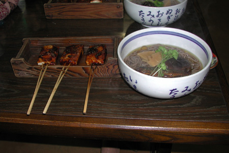 お参りを済ますと、精進落としの鯉をなでる。 満願霊場だけのものである。 山門を出て、茶店でいつものとうふ田楽と満願そばを食べた。 とうふ田楽は、赤みそのたれに山椒が利いて、いつ食べても美味い。ひなびた美濃の味と言えようか、好物の一つである。 満願そばは、当然のことながら今回が初めてで、精進落としということで、ニシンか鮎か気に止めなかったが小魚が入っていた。