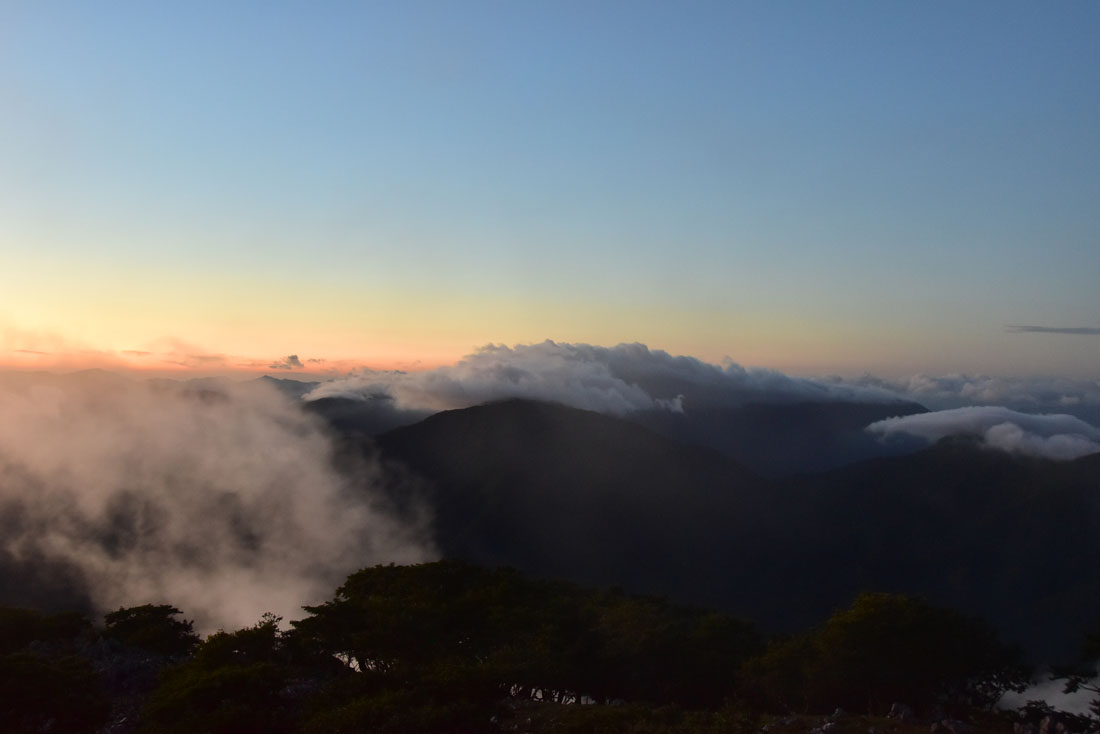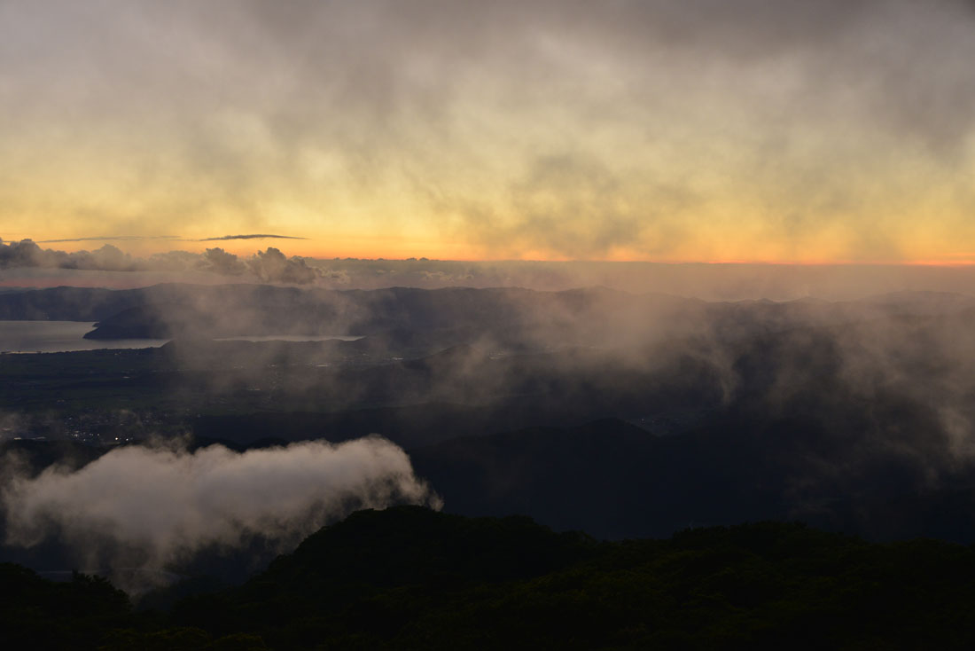 ドラマチックな夕焼けを期待していたのだが日の入り方向に焼けそうな雲がなくガッカリしていると、東の方から雲が湧いてきて山頂付近の我々を越えて西の方へ下って行く。ガスは夕陽に赤く染まったり、ベールとなって琵琶湖や山々を神秘的に見せてくれたりした。まるで高山に登ったかのような珍しい体験をした。 (2025年07月25日) |
