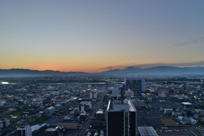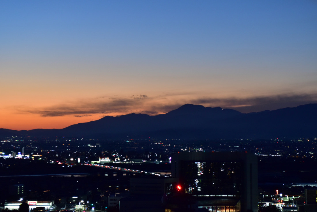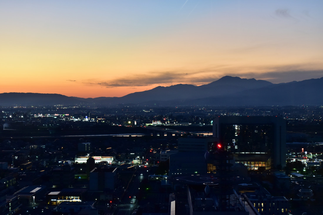 2023年1月に開庁した新岐阜県庁の20階の展望ロビーが9月から土日祝は夜8時まで正式に一般開放されることになった。展望ロビーは四囲がガラス張りになっていて、高さ90mから360度の眺望が楽しめる。西から順に伊吹山、柳瀬、岐阜城、名古屋方面と夜景を見て回ったが、落ち着いたのは伊吹山方面のみで、他は街灯りが少なかったりロビーの灯りの写り込みがあったりした。伊吹山方向に陽が沈む3月と9月にまた来て夕日を撮ろうと思った。 (2025年11月11日) |