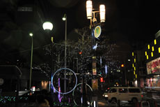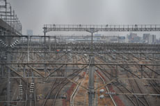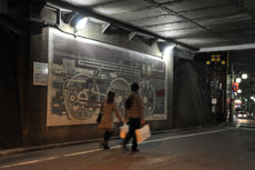 夜編も撮ろうということで小雨模様の中、カメラを持って出かけた。駅西側の高い歩道の上で色々試みたが、光跡を狙った車もまばらで思うような写真がなかなか取れなかった。 寒さのため早々に店じまい、撮りおさめは好きな機関車の絵。 (2011年2月) |